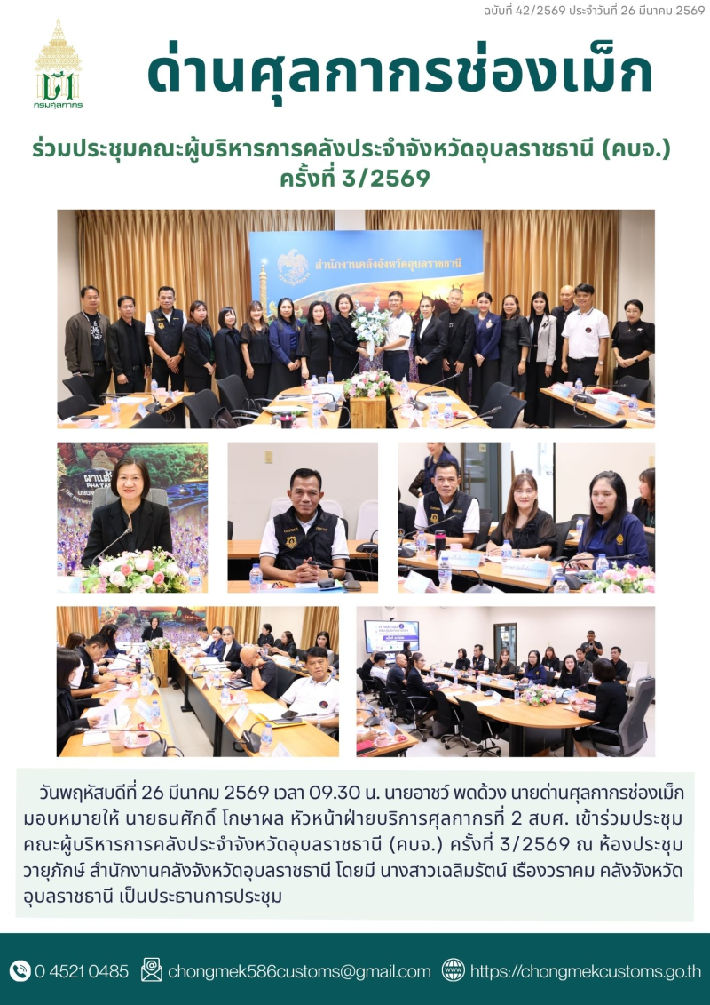 *-* ด่านศุลกากรช่องเม็ก ร่วมประชุมคณะผู้บริหารการคลังประจำจังหวัดอุบลราชธานี (คบจ.) ครั้งที่ 3/2569