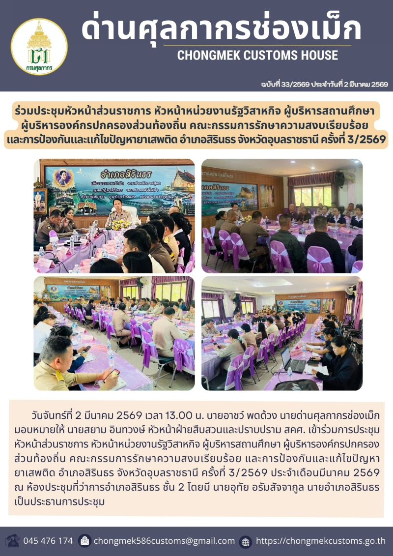 *-* ด่านศุลกากรช่องเม็ก เข้าร่วมการประชุมหัวหน้าส่วนราชการ หัวหน้าหน่วยงานรัฐวิสาหกิจ ผู้บริหารสถานศึกษา ผู้บริหารองค์กรปกครอง ส่วนท้องถิ่น คณะกรรมการรักษาความสงบเรียบร้อย และการป้องกันและแก้ไขปัญหา ยาเสพติด อำเภอสิรินธร จังหวัดอุบลราชธานี ครั้งที่ 3/2569