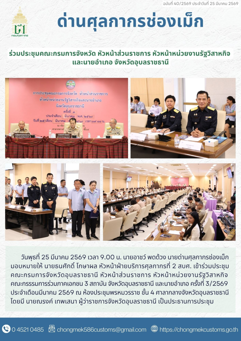 *-* ด่านศุลกากรช่องเม็ก ร่วมประชุมคณะกรมการจังหวัด หัวหน้าส่วนราชการ หัวหน้าหน่วยงานรัฐวิสาหกิจ และนายอำเภอ จังหวัดอุบลราชธานี